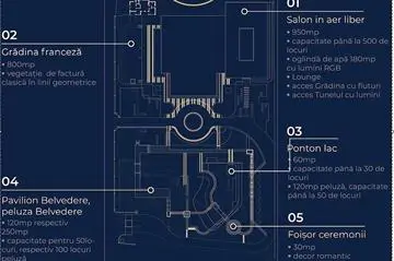 Continuând specificul locului, elementul „apei” este prezent în numeroase forme: o cascadă impresionantă care alimentează un lac cu nuferi, o fântâna arteziană triumfală și un luciu de apă de aproximativ 200 mp pentru evenimentele în aer liber.